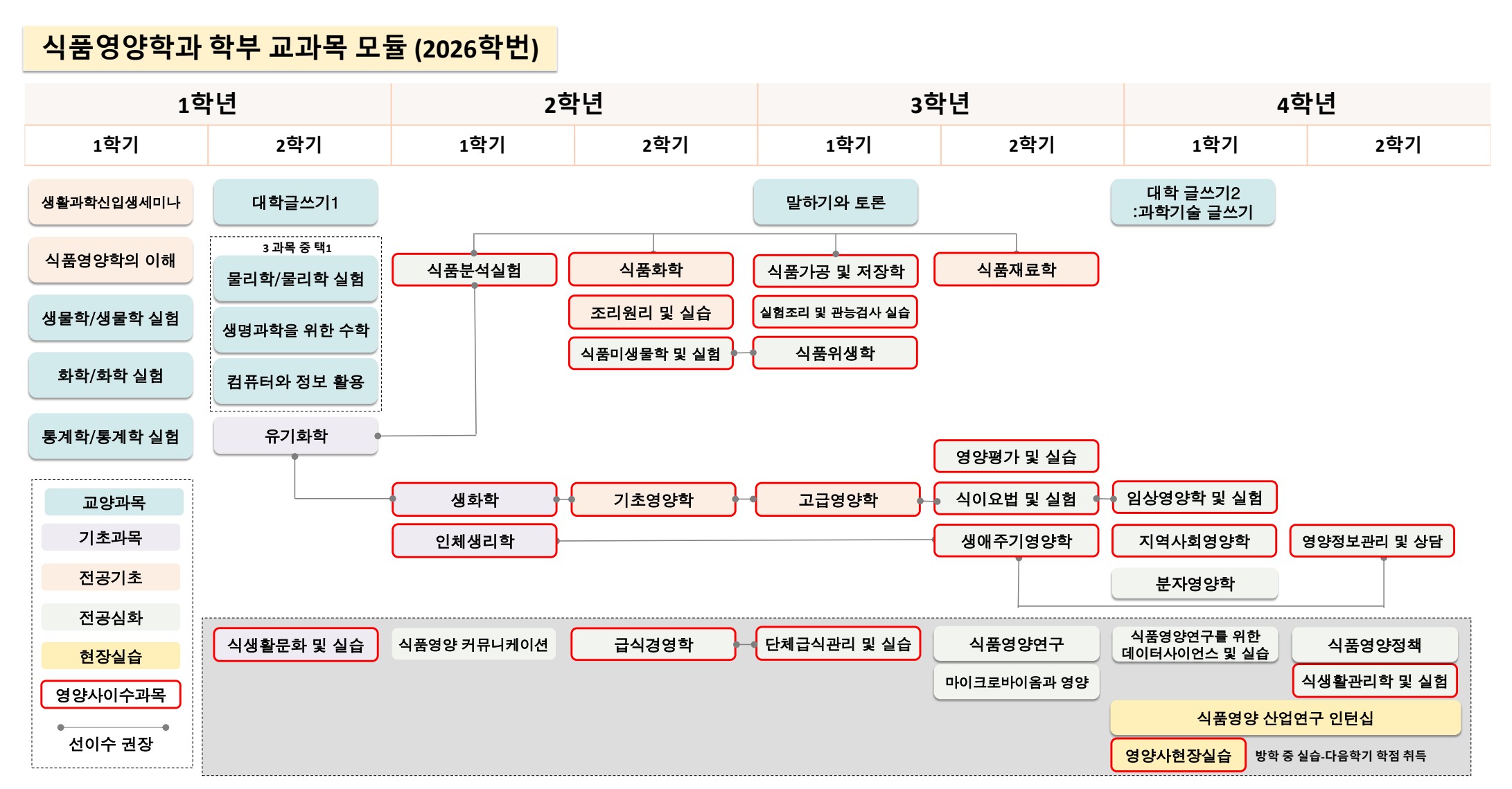 352.401A 식생활관리학 및 실험* M1460.000500 식품영양정책* M1460.000400 식품영양산업연구인턴십 2 M1460.002400 영양정보관리 및 상담* |